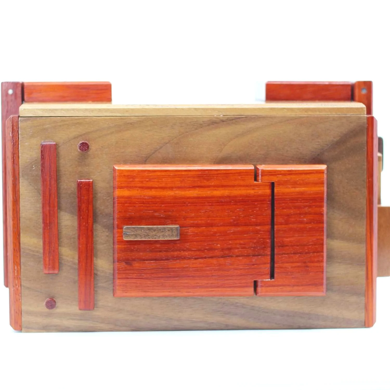 Bassackwards has a mixture of everything I find fun in a puzzle box. It’s a beautiful object that immediately draws ones attention. The excellent wood choices lend warmth and contrast. There are numerous details which invite a myriad of options and possibilities for initial exploration, which is an enjoyable experience without even getting anywhere. The level of difficulty achieves a perfect balance. There is a lot to discover, and it doesn’t come all at once, but it can likely be fully solved after a few sessions by most intrepid explorers. Everything is well hidden and there are many unexpected movements and connections that are not at all obvious. I found it paradoxically enjoyable to discovering a move, only to realize I was stuck again. Like the best puzzle boxes, it gives you an “aha” followed by a “now what”? This box provides that experience many times over. It’s a great way to design a box and gives the solver a lot of satisfaction, right up to the end, when there is yet one more challenge once you think the box is solved.