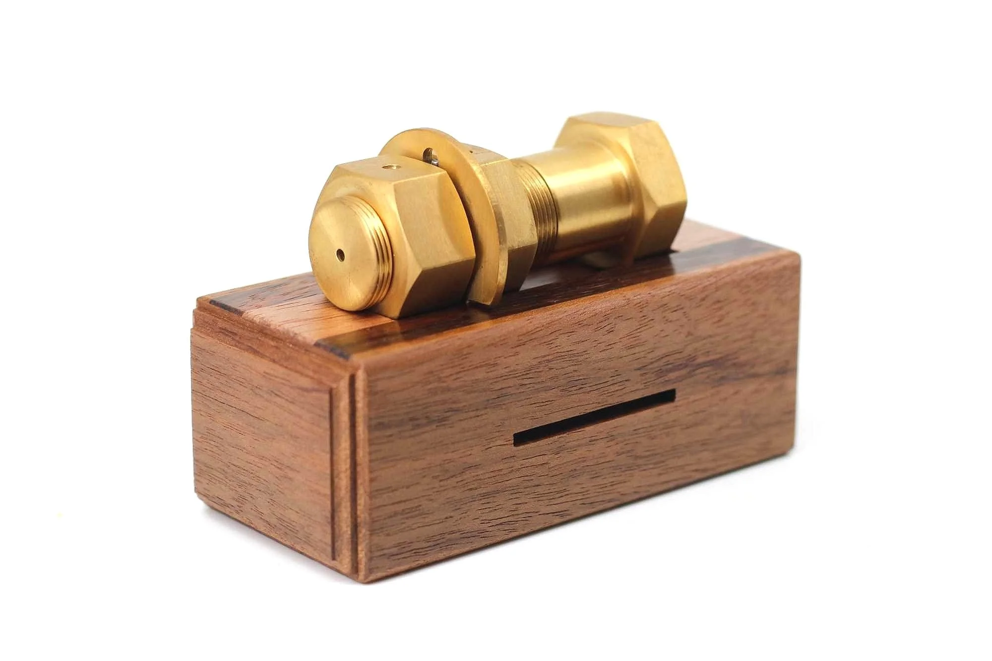 Brian’s Big Baffling Bolt is the result, a hefty bolt made in house from solid brass hexagonal and round stock which sits atop a beautiful box made from Papua New Guinean Ebony. There is clearly a lot going on with this bolt and box, except that nothing is happening or opening. Anyone familiar with a “bolt” puzzle will know that the goal is typically to remove a washer or nut, basically take the thing apart, but there is some trick preventing that from occurring. Brain and Sue describe why the Big Bolt is a bit different: “Most bolt puzzles have just one or two moves but Brian wanted to make a full-blown sequential discovery puzzle out of a bolt. In the end, he had to hand-make the bolt too! To celebrate 30 years of puzzle making Brian included a few well-disguised hints of puzzles past. But don’t think that means you’ll solve this one easily. This approach is a little unusual, Brian normally would like to put something radically new into every puzzle that he releases. But this one is actually more like a greatest hits of a lot of his designs to celebrate the last 30 years. Even so, you might not easily recognise some of the moves.”