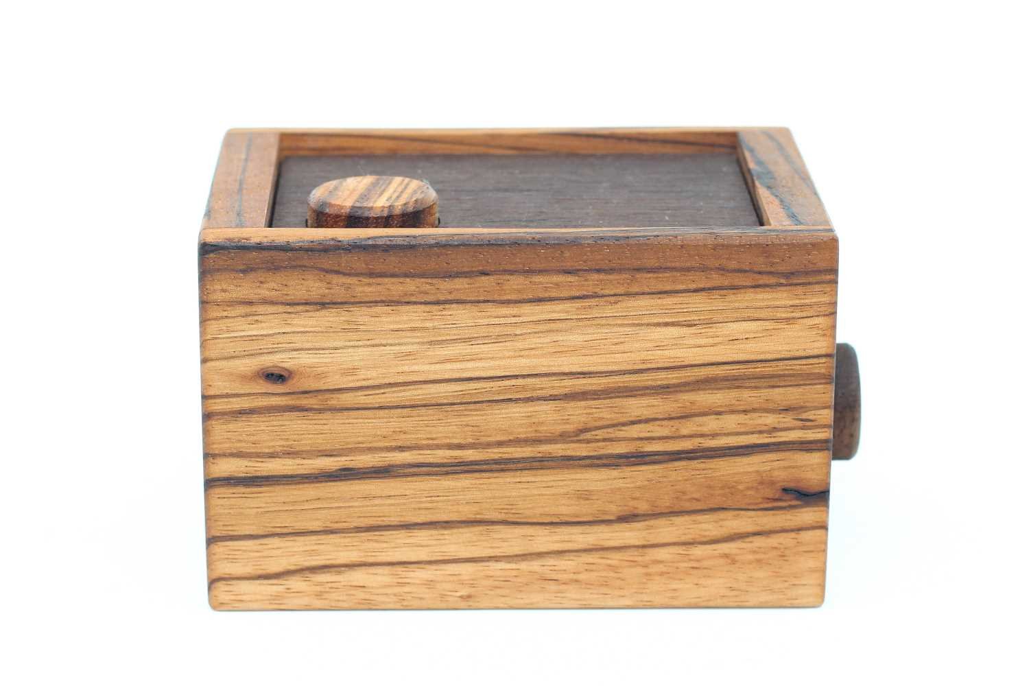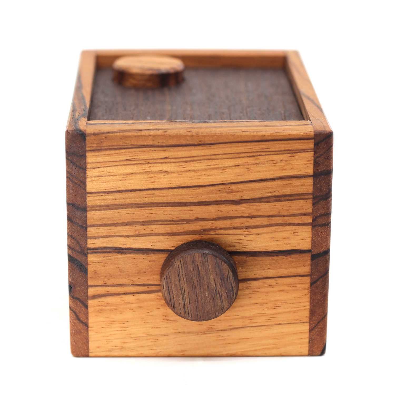 The Blinded series are all nice examples of Dee’s work. They are expertly crafted from beautiful hardwoods in a classic aesthetic. Their simple elegance hide tricky internal mechanisms which lead you along several steps with varying degrees of difficulty. Subtle clues guide you along the way as you explore what can be done. Dee’s work is always a pleasure to handle and explore, and the Blinded series is a nice example of his puzzle box style which traces its roots back to the beginning.