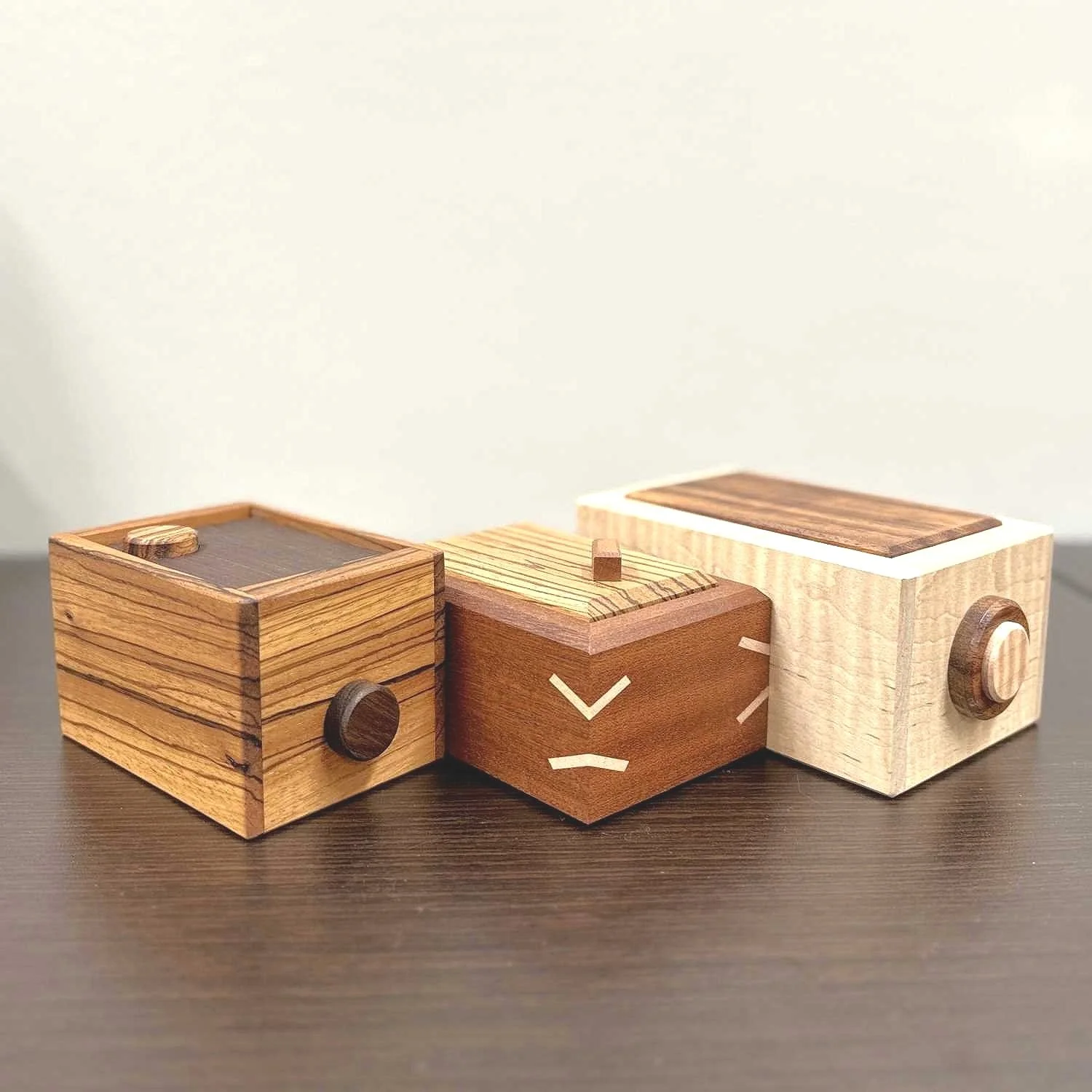 Dee Dixon did the puzzle world a favor when he decided to dedicate himself fully to designing and crafting his beautiful, delightful puzzles. Now in Utah, this journey started for him in Idaho in 2019, back when he was crafting furniture pieces and jewelry boxes. For some fun, he would create one-off boxes which hid clever internal locking mechanisms, ranging from simple to fiendish. He didn’t know there were hobbyists and collectors in the world waiting for such creations. But he began to offer them online, and people like me bought them. One of these original designs was called “Blinded”, due to the inability to see what was going on inside. Which was not a bad name for many of those early designs!