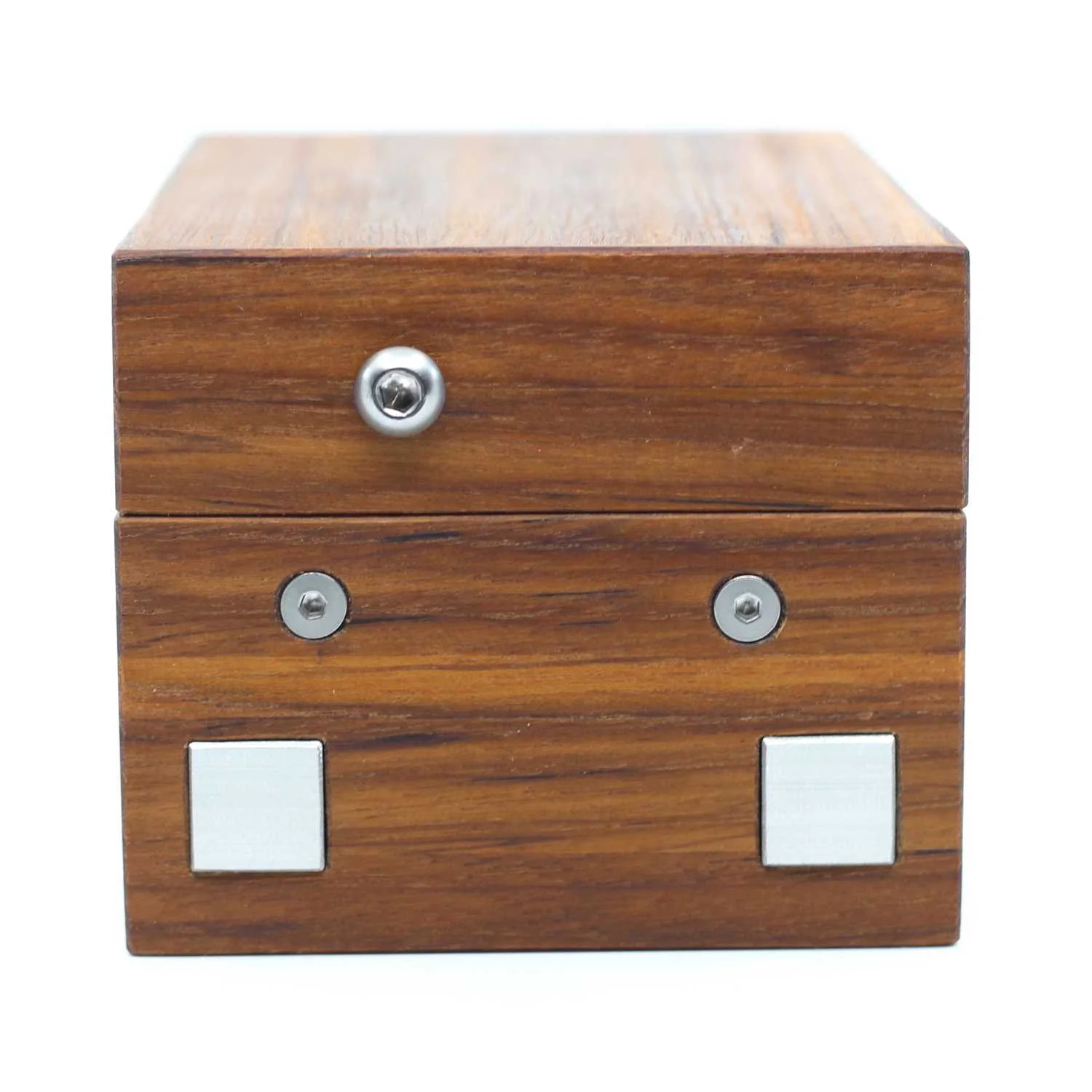 DGHV1 is a handsome and hefty puzzle box, veneered in richly textured teak wood and finished in Tung oil which brings out the glow. Doog has managed to reduce the size of this box as well, so it feels really good in the hands as you explore the many interesting components on each side. It’s literally packed with mechanisms, which Doog characteristically makes out of steel and aluminum, so the compact box is really solid and heavy. Which all makes for a promising production, and Doog keeps the promise. DGHV1 is aptly titled. If you’ve solved any of his prior boxes, you may recognize a few familiar concepts, but nothing feels repetitive, obvious, or easy. Having solved his other boxes before did not seem to help. There are some great tricks that kept me confused and put a smile on my face once understood. This seemed to happen over and over, as each of the many steps are eventually navigated. The whole experience, including the brilliant finale, is hugely satisfying, in the way the best puzzle boxes can be. I’d say it lives up its name, and in so doing has become Doog’s best box yet.
