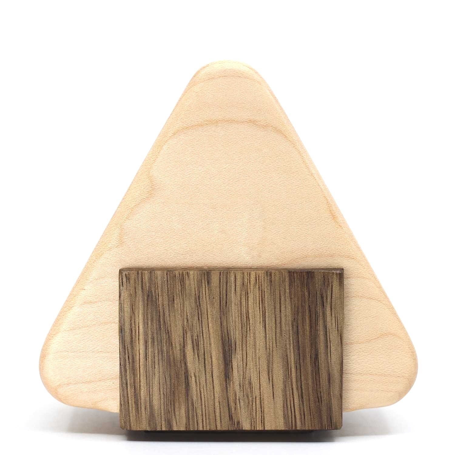 I absolutely love Japanese puzzle boxes that look like real world objects like food, animals, houses, radios, cameras, bottles, etc.. and I know that I am not alone in that interest! I love the challenge in this because remaking objects is very tricky, everyone knows what those objects should look and if you don’t perfectly capture the correct shapes, proportions, color… the box will look very bad. So I started coming up with a few designs that would align with what I love and knew would be a difficult challenge to make and progress as a woodworker. As I mentioned throughout our trip in Japan i was writing down ideas for puzzle boxes and came up with the idea for a rice ball shaped box during one of our frequent snack breaks at 7/11 and Lawson.” It may have been very tricky but Jason has done an outstanding job of creating the rice ball shape. The object is of extremely high quality, lovely and smooth in contrasting woods. It is also far more complex than it might appear. “While this design may look simple from the outside believe it or not there are 39 very precise pieces used to make up the box and the internal mechanisms (most of those pieces are in a very small area). As with all of my work this box started with a run to the lumber yard and then cutting, milling and processing 10’+ long pieces of lumber down to each individual piece using the tools in my garage. One fun fact is that while the final shape of this box is a triangle, up to the very end it is built and processed as a square which helps ensure proper alignment, secure glue ups and ease of making the pieces.”
