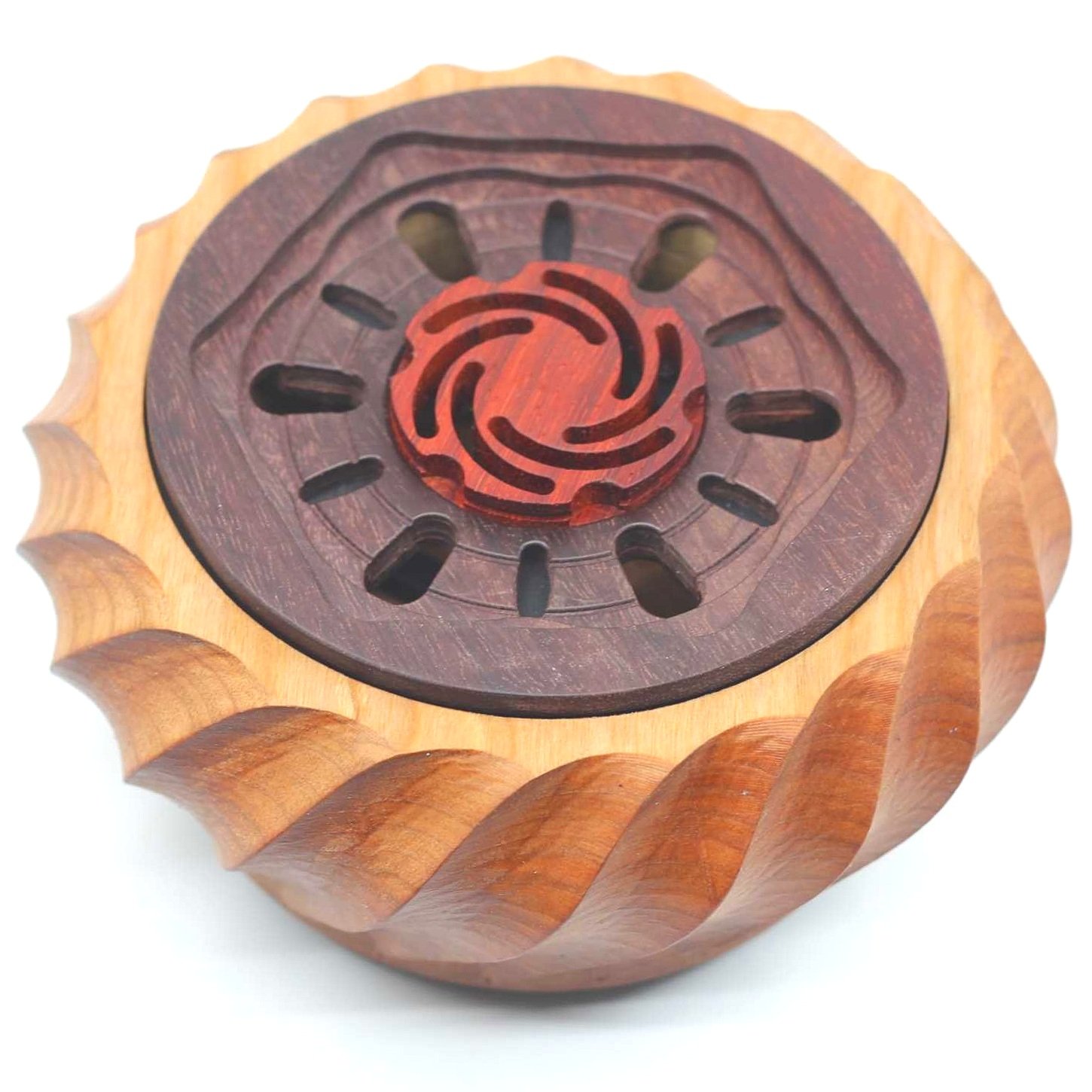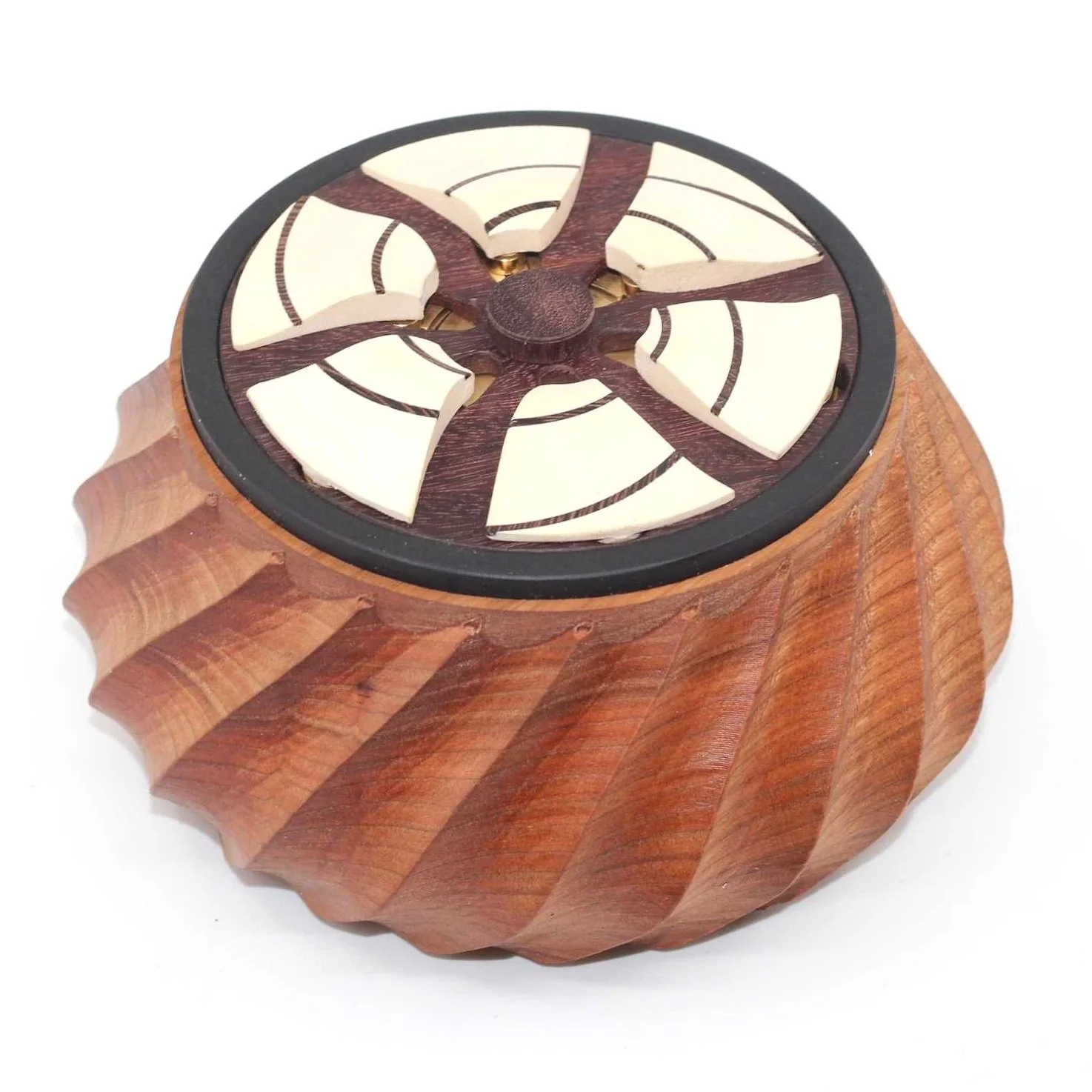 Jesse remains a bit flabbergasted by the fact that these mathematical puzzle boxes actually work as intended. “The chances, I don't - I don't even understand what the odds are as such but it sounds so crazy and it works. To some people it might seem random but it is kind of neat that it works out and that the Pi [box] works out and they complement each other. I made the Pi box back in 2019 so it's been 4 years since and so I wanted to raise the level of craftsmanship and I think I did. Objectively this box is more visually stunning and much more advanced in every way except that instead of the yosegi [on the Pi] I went with inlay because I only had to make 50 of the Pi Box but we have to make 610 of these.” I’m not sure anyone will mind the style choice here because the inlayed spiral works really well for the design and looks elegant, along with the varied mixed materials including brass, and many fine details present, all housed in a gorgeously figured twisting case. The piece is incredible, a true work of art.