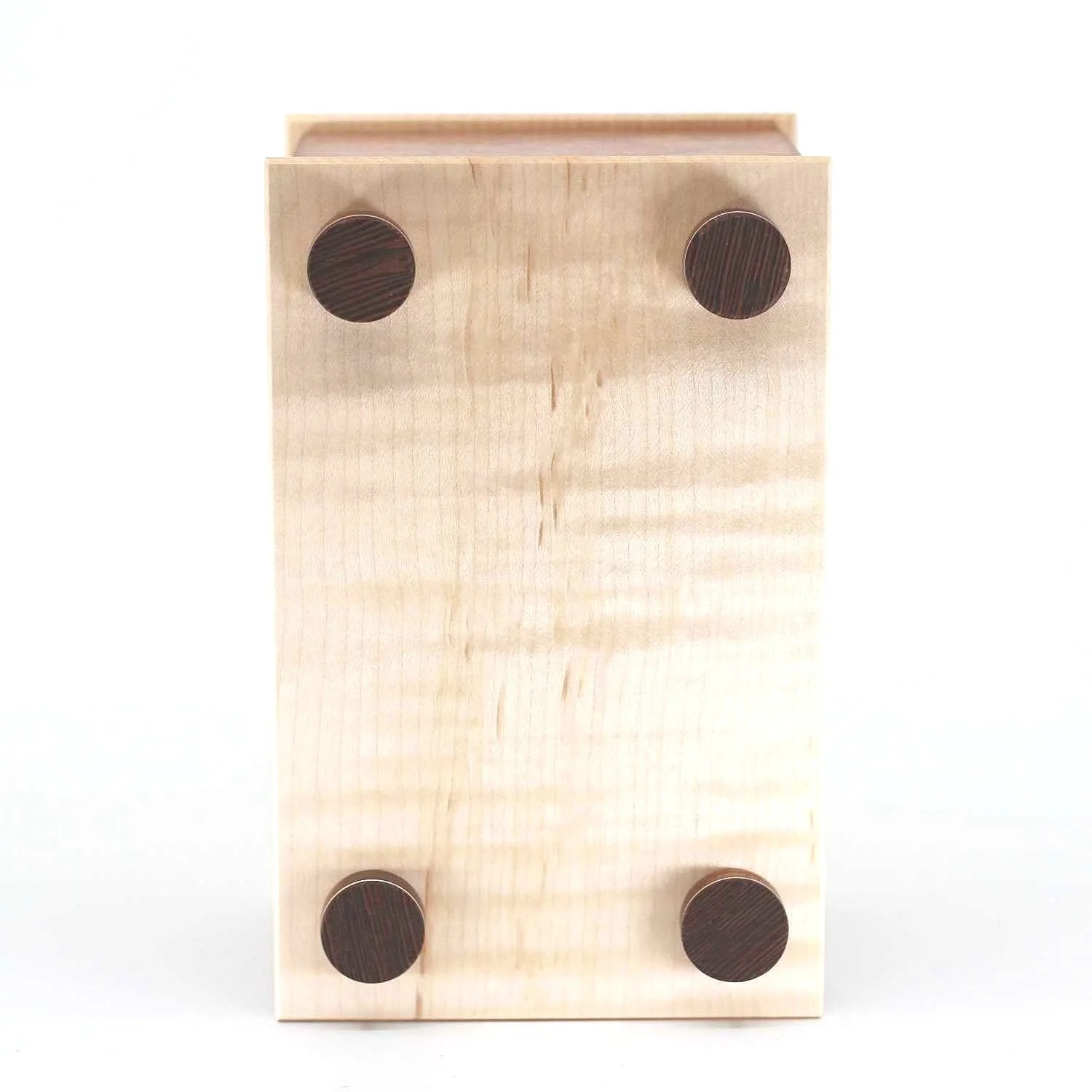Kagen had been thinking about making a box which uses this magical mechanism for a while. He had also been thinking about making a fun Karakuri type box. Previously these ideas were always too literal for him, too far out of his comfort zone. But somehow the idea of solid wooden batteries became too compelling to ignore – it was too good to pass up and the time was finally right for him to “challenge myself to think that way, out of my comfort zone with a more literal, riddle type box. I wasn’t quite sure it was possible.” But then he made one. “Ok, I can make it work once. Can I duplicate it over 20-30 copies?” Many iterations and changes were made along the way to deal with reliability and inherent changes which occur in wood like warping that could disrupt the mechanism and be unreliable. Parts of the box were changed, and even the initial batteries had to be remade. “The original wood used was Tasmanian Blackwood, which has a sort of sign wave patterned grain running lengthwise through it (it is a curly grained wood). Humidity increased the length of this wood slightly due to the grain pattern, which was something unexpected, and essentially rendered the batteries inoperable. It was an interesting problem to face.” He pivoted to using straight grained Cocobolo, and in the end loved the Rosewood better anyway, which was more colorful and special when contrasted with the sapele wood of the box body. The woods used in the box also have a story. The sapele for the box is from the same board used on the Lotus Tables. Kagen keeps all the old fragments and boards from his projects over the years, and even the scent of the wood recalls the old projects and his memories of making them. There is a little bit of ebony in the box from the Lotus Table as well. The feet in the box have a bit of green Lignum Vitae wood detail running through them, which was a leftover, unused part from the Pipe Organ Desk.