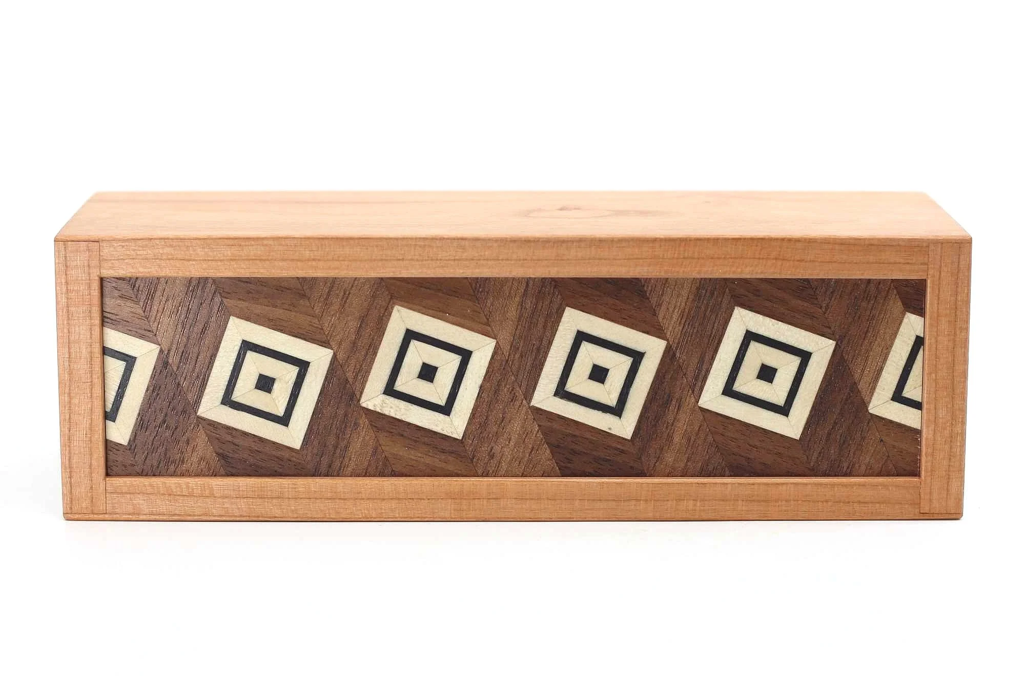Kagen’s “operated box” series is thus a response to all of that, and his version of what some might call a “sequential discovery” puzzle box. Kagen has been enamored of the ancient Japanese woodworking technique yosegi-zaiku, creating thin veneers from hundreds of tiny wood pieces arranged in a block of geometric shapes. He says this “continues to be an incredibly exciting ability” of his which he lately attempts to employ whenever possible. In the Bookmark Box set, there are three different patterns of yosegi he has created to differentiate the boxes (and the bookmarks!). On the first (walnut), and easiest in the set, the yosegi came about from his interest in the “plus” shape (or “pinwheel”), creating a sort of checkerboard, adding some pinstriping and also rotating every other “plus” symbol. The second (purpleheart) and third (cherry) Bookmark Boxes are closely related in a special way. They add layers of complexity to the opening puzzle, building up to the frustratingly challenging third version. They also share a story in the yosegi. On the purpleheart box, the yosegi features striped rectangle patterns which came from Kagen’s lotus and café wall table projects of many years ago. The overarching theme here was to create classic Greek Key patterns from the shifting rectangles, and it is a pattern we will see again in another upcoming project. Part of the yosegi process involves cutting off end chunks from the blocks, which are typically sent to the scrap pile or trash bin. Kagen noticed that if he glued these cutoffs together instead, they created a whole new pattern – what is found on the third Bookmark Box!