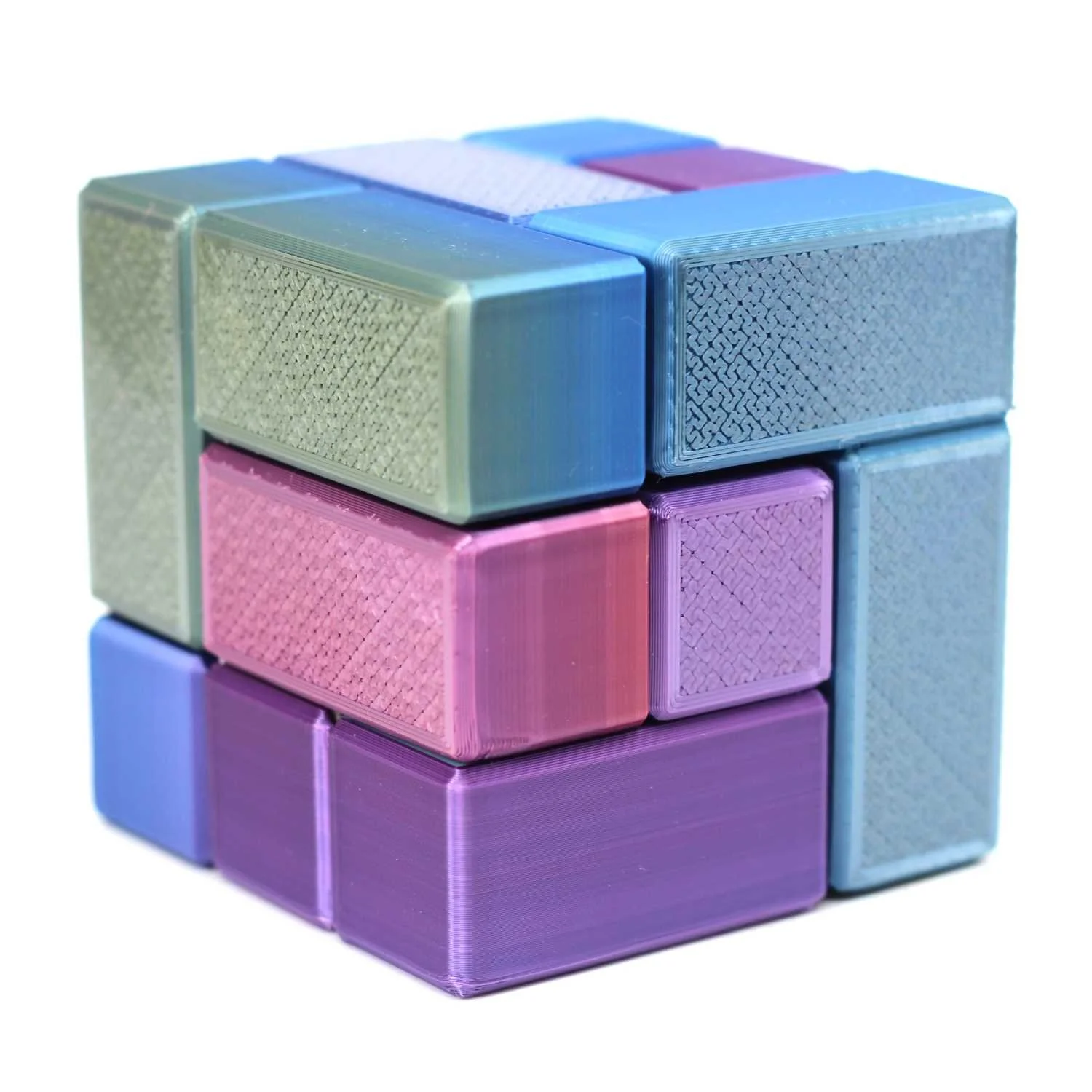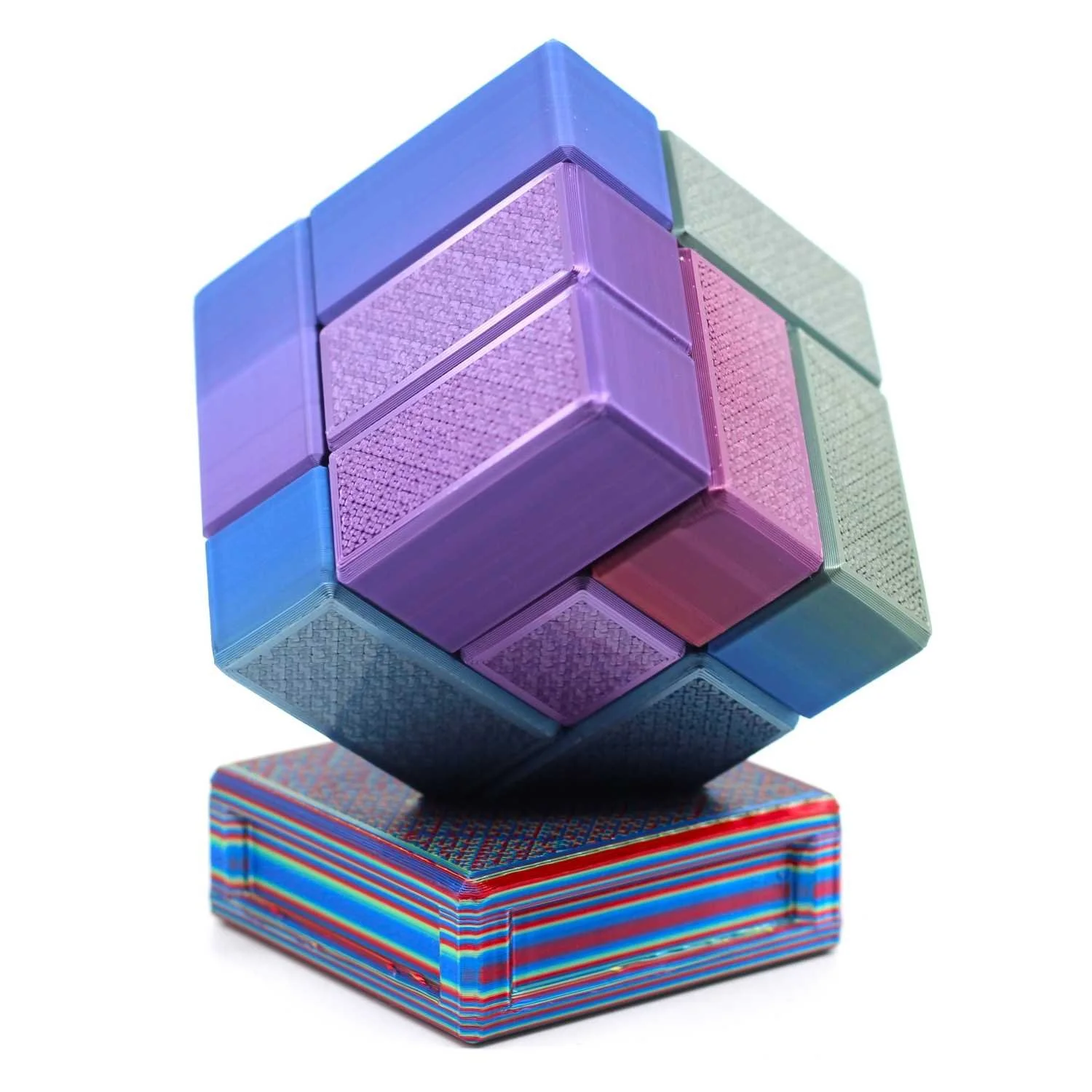 Scion began life as an idea to reproduce Juno’s SDCB puzzle, an idea which became an homage and a unique puzzle instead. Brian had the CAD skills, and Kris had the 3D printer. “I was amazed watching him work. I would describe something and it would just appear within seconds on the screen. I brought up designing a puzzle but was easily brushed off. Brian would much rather solve a puzzle than design one, as that is just one more puzzle he doesn’t get to solve. I can relate, I think we all can. Not to be deterred, I asked Brian again, what if we just made our own SD cube?” Kris challenged Brian to “start something” that would be inspired by the first move in Juno’s SDCB, but perhaps in reverse. Brian had designs ready the next morning for the opening sequence of what would become “Tessy”.