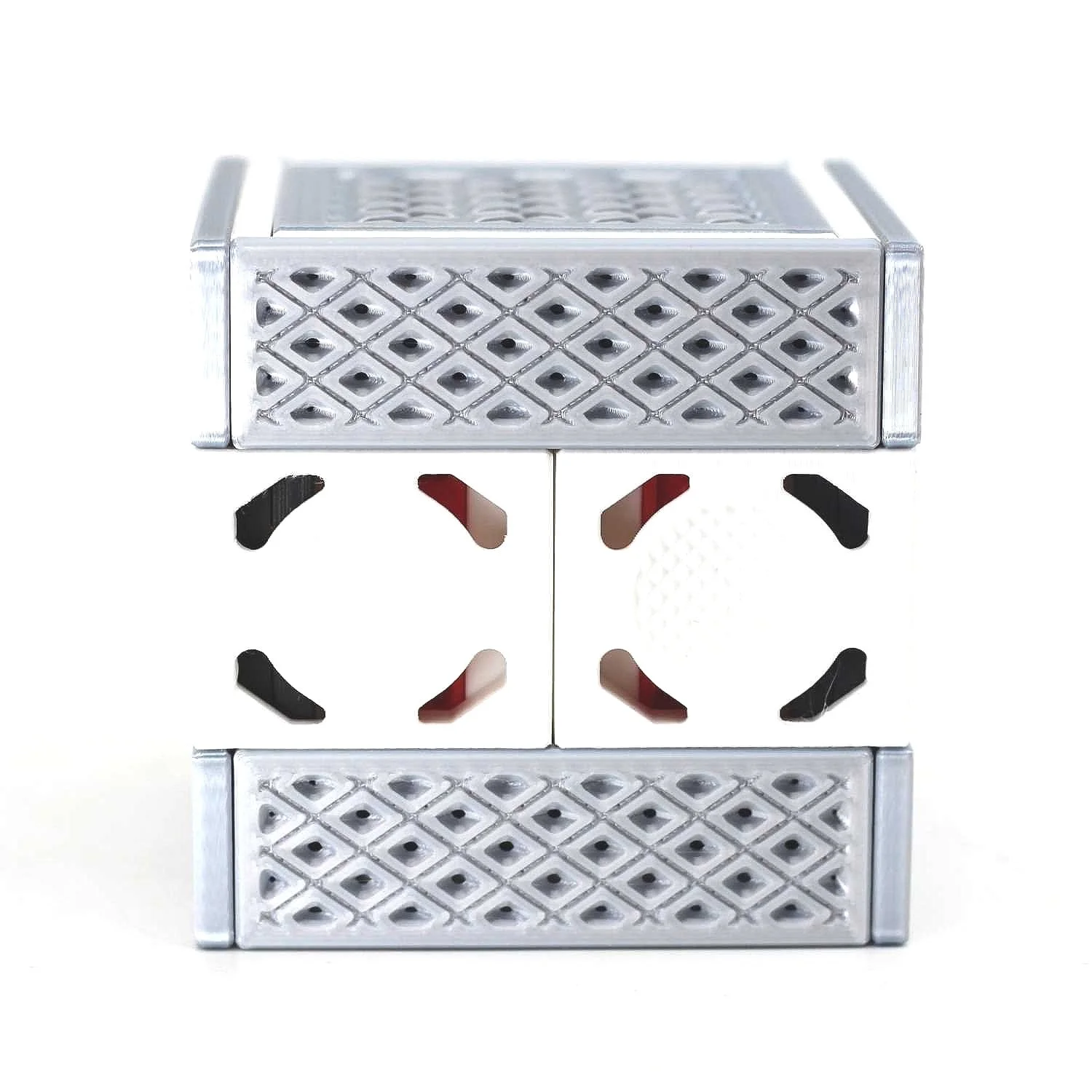 After 1-2 years of resting the original Piston prototype, Lee redesigned it into a cube shape which could contain the additional maze plates in the inner space. Tweaking the structure to have the maze plates fit inside the box came from ideas started years ago in discussion with Kagen Sound and John Rausch over Kagen’s Maze Burr puzzle, which originally came with additional maze panels in a separate container. Lee made a metal version of the maze burr. It seemed a shame that the extra plates couldn’t somehow be contained within the puzzle itself. Kagen solved this problem in later iterations of the Maze Burr Box and its descendants, and Lee has designed the Piston Box with a similar sensibility.