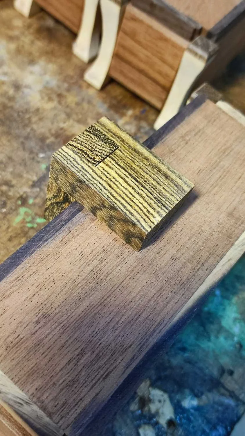 The puzzle comprises a set of six polyomino pieces with the interesting property that each piece is made with one additional block, starting from a two-block piece and going on up to a seven-block piece. The pieces start to become oddly shaped as they get larger. They are made of beautifully colorful exotic woods and come nestled inside an even more lovely little figured case with tapered legs and a wood hinged lid that opens and shuts with a satisfying click. The challenge is to remove all the pieces and reassemble them into a cube. Easy!