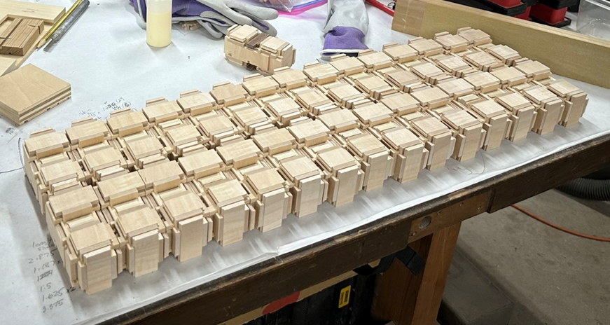 For me, a good cake and a good puzzle box always starts with lots of layers. Because every new layer means more of that scrumptious icing! RVC begins with a structure built up from Basswood and a little bit of Walnut. Many weeks are spent cutting and combining the tight tolerance pieces to form the base for permitting movement around the core.