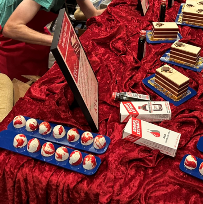 The final display for the IPP41 Puzzle Party table included actual red velvet on the table along with samples from Adams Extract and their original recipe for Red Velvet Cake.