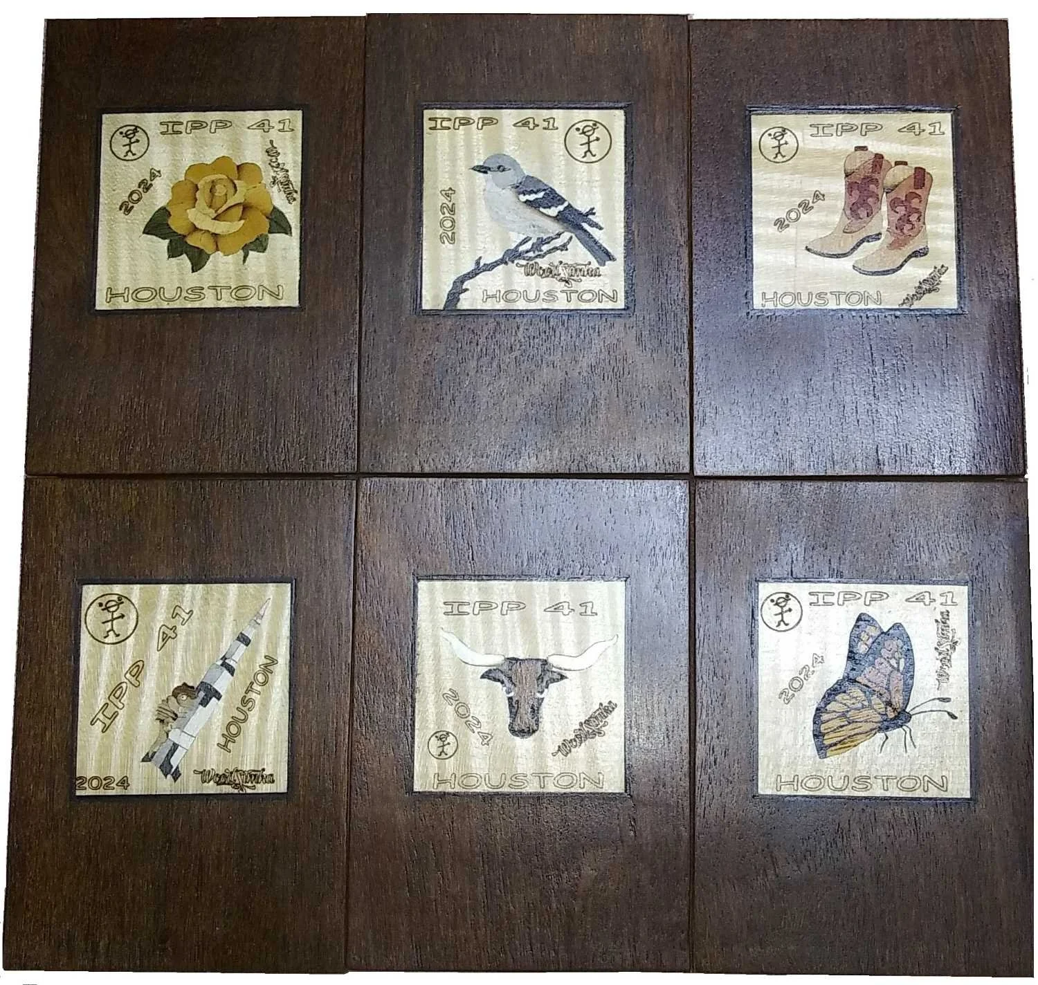 Early on in the project development, Rob and I discussed how we might add some eye catching detail to these boxes, while maintaining a reasonable cost for the workshop. This evolved into commissioning a series of Texas themed marquetry veneers from a very talented craftswoman from Europe who agreed to help. She sent the completed veneers to Rob, who applied them prior to the workshop. Kits were placed face down on the tables, so people would not worry about which of the pretty pictures they got!