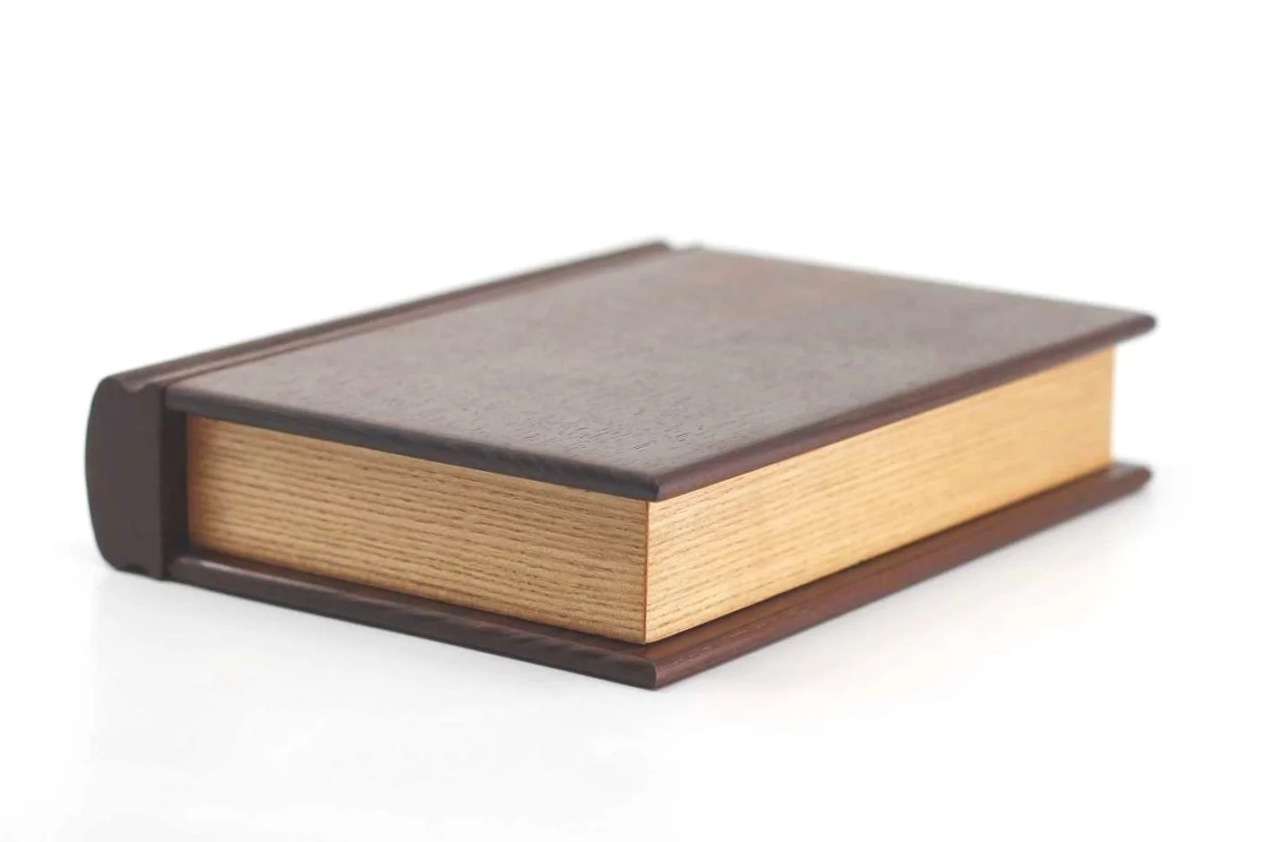 Bill relates the impetus for his series of Book puzzles came from … a book! Puzzles in Wood, by Edwin Wyatt, is one of two small volumes by Wyatt on puzzle making that Bill owns. Inside its pages he found a design for a simple puzzle box that looks like a wooden book. He made it, but felt that it was too flimsy. He devised a way to make it more sturdy with a modification to the design and the inclusion of a few magnets. He didn’t make many of these original Book puzzles, because he felt they were too easy to solve. What many people refer to as his first Book puzzle box is thus actually his second, the Book II, which built on the first version by adding a new locking component and a “sequential discovery” aspect, while maintaining the essentials of the original. I suppose we can call it the second edition printing with a new forward by Bill.