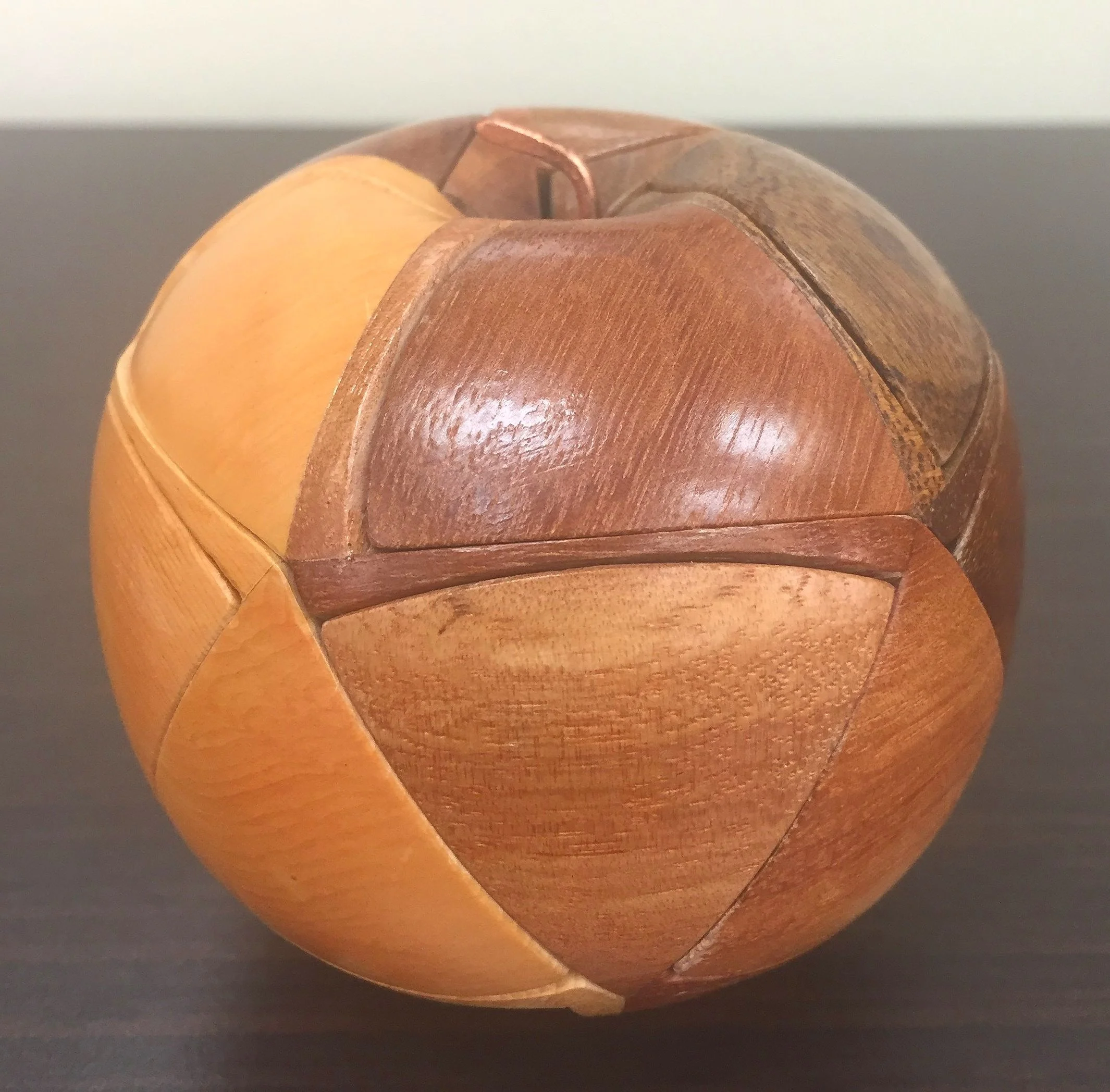As luck would have it, I recently got to enjoy a few of Stephen Chin’s amazing pieces through a friend who is extremely generous with lending out his rare puzzles. One of these was a rare and radiant apple with very few copies in existence. As the saying goes, an apple a day keeps the dentist away. Stephen Chin’s “1 Pinko Ringo” (don’t ask me how he comes up with these names), is a lovely wooden apple with an unusual flavor. It’s based on the designer Wayne Daniel’s original icosahedron puzzles, in which a perfect twenty sided polyhedron shape is composed of ten identical pieces, half of which are mirror images of the other half. As he likes to do, Chin converted that original design into a spherical shape – in this case, an apple. Spin the apple around a few times and watch out! All ten pieces come flying apart and land in a jumble – oh no! Thankfully, due to the shape of the apple motif, and the colorful exotic woods used in the puzzle, it is not as difficult as it seems to decipher which pieces go with which others. The really hard part is determining how to coordinate all ten pieces back into place so it all holds together again. Figure that out and you’ll be the teacher’s pet. This is a wonderfully elegant, beautifully crafted puzzle which showcases this master “hobbyist’s” remarkable skill.