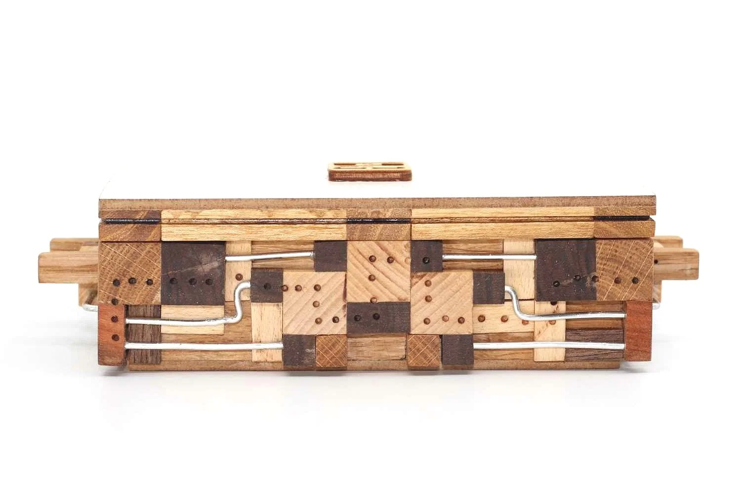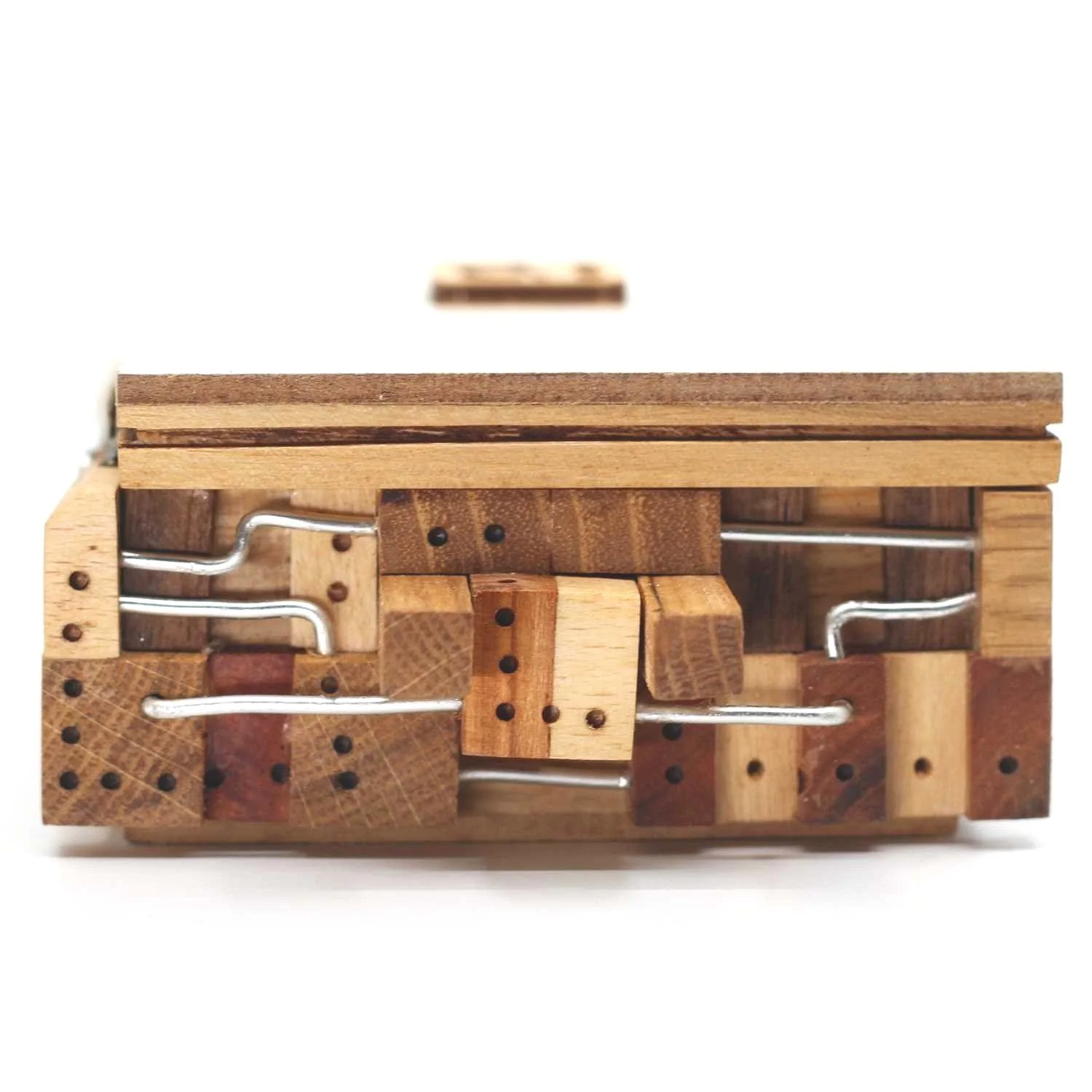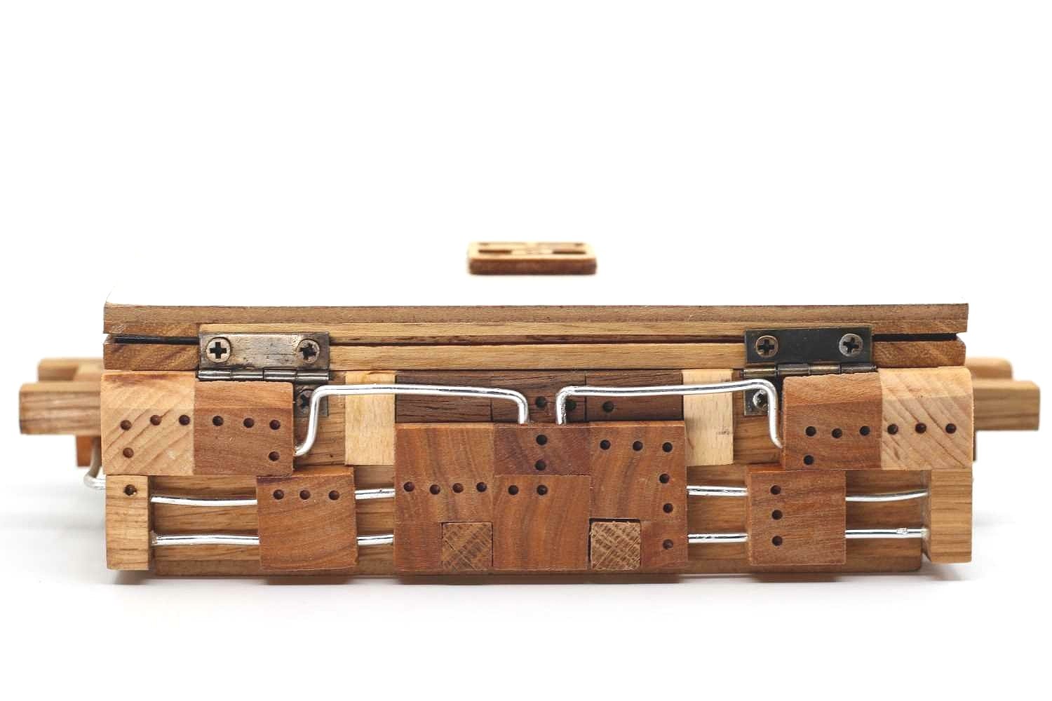 “The box is a very old idea, but it was never implemented. I’m more at home in movable and assembly [type] puzzles, planning and making them, so I just admired the tricky boxes, but I didn’t design or make them. Then I came up with the idea to combine the two things, and this is how the box was born, the inside of which, the lock structure, is a classic moving arrangement. It takes 13 steps to remove the top of the box. I designed the internal lock structure with the BurrTools program and published it on https://www.vanyotamas.hu/