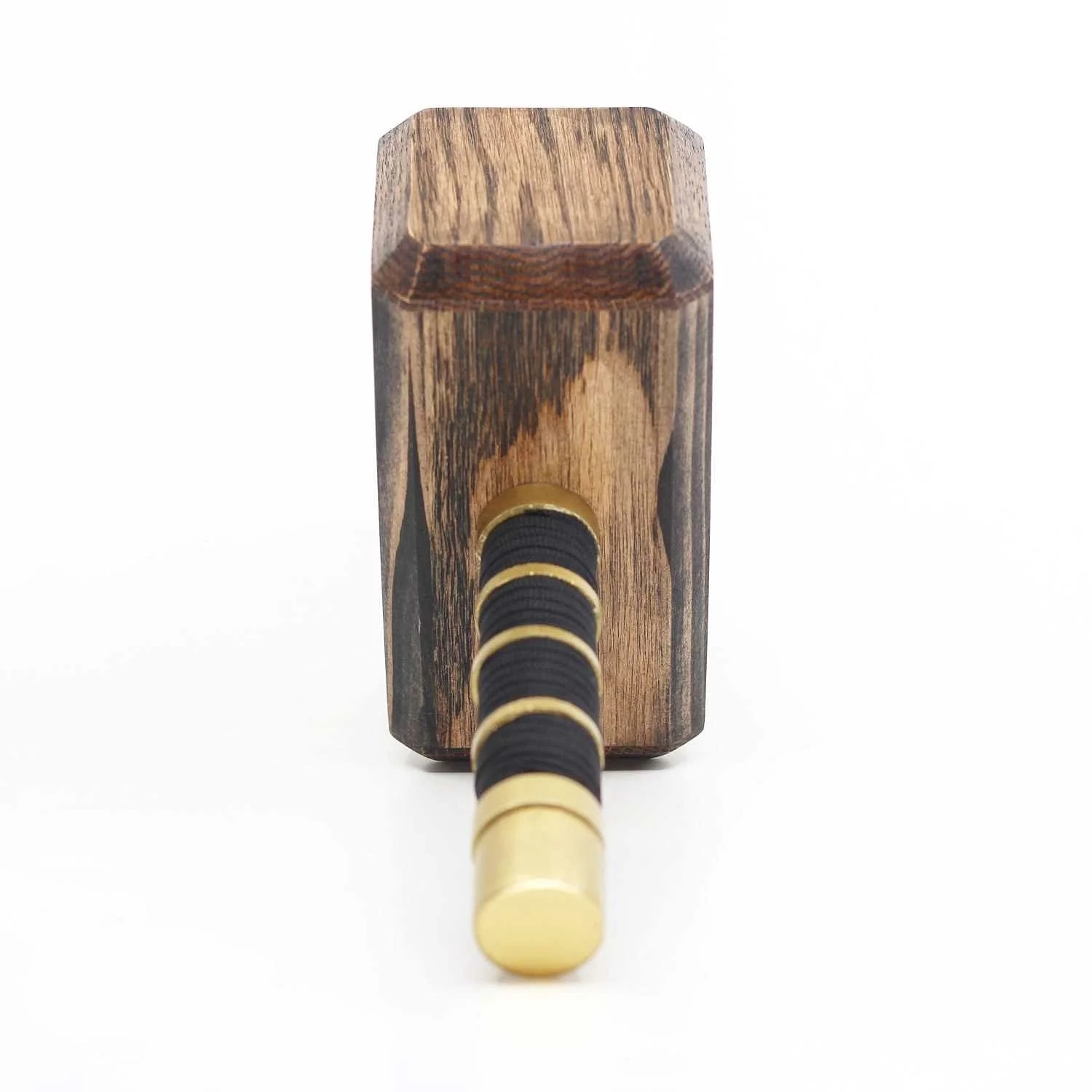 Woodworker Tyler Williams of the Beard’s Woodshop Company had a stroke of genius when he thought it might be fun to recreate Thor’s famous hammer as a puzzle box. Tyler had been making a separate puzzle box that had been selling fairly well when the idea of turning it into a hammer came to mind. He discovered that it is not so easy to make a themed design work with the intended mechanism, but he succeeded. Thor’s Hammer quickly became a best seller and with it brought Tyler a lot of attention. He spun the idea off into more “Avenger” themed puzzle box ideas, some of which are in development and others already produced, such as El Capitan, a Captain America themed box. Tyler has made a few different production editions of the hammer, including this smaller scaled down sized limited run made from Black Limba wood. I think it fits the theme even better, since in the Norse myth Thor could shrink his hammer down small enough to put in his pocket, if he wanted. It also fits on the shelf quite nicely – the standard edition version is huge!