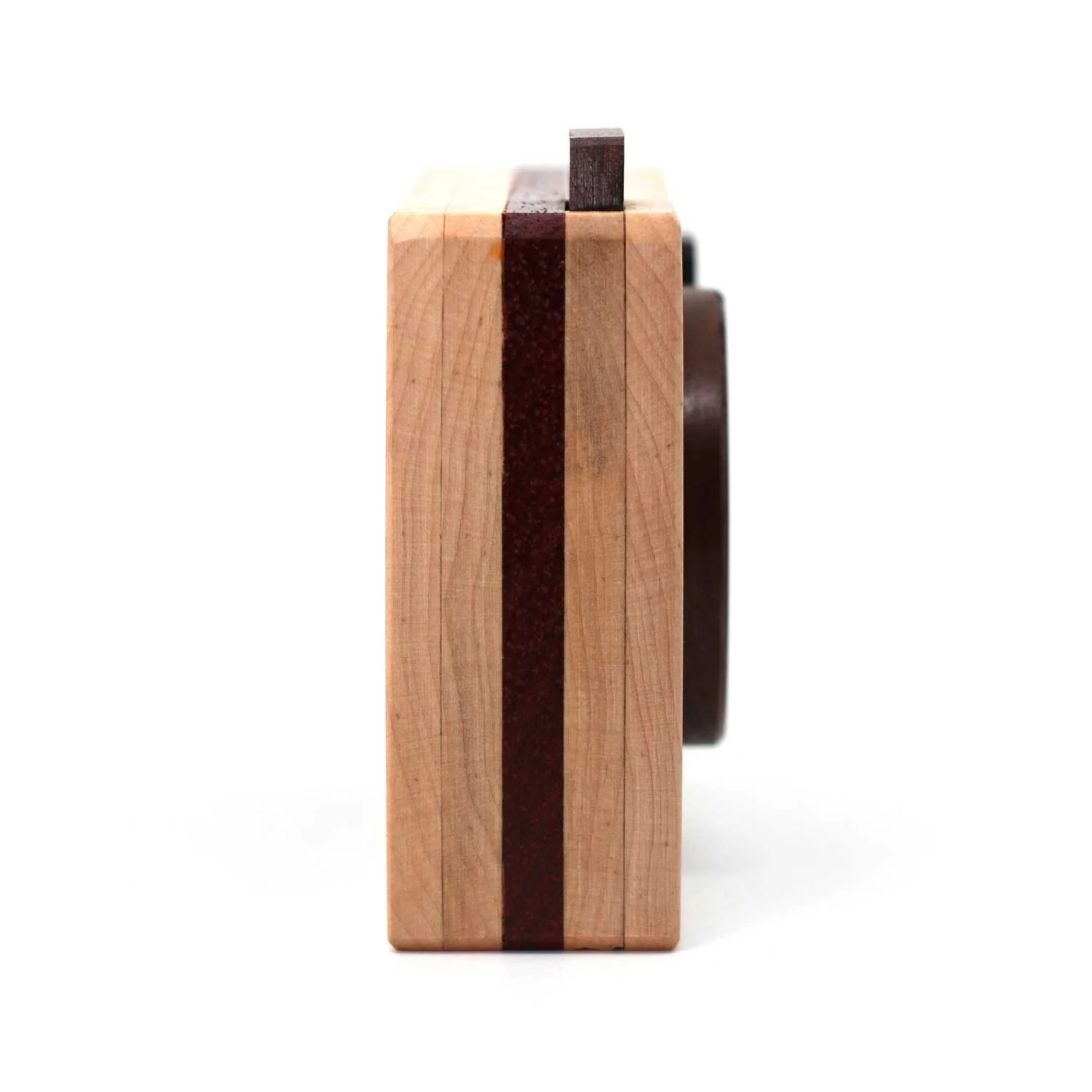 Puzzle maker Tyler Williams of Beard’s Woodshop Co was channeling this history when he created one of his newest boxes, the irresistible 35mm. Tyler often makes his creations in various contrasting wood types and colorful burls, and the many iterations of his new camera themed puzzle are all very nice to look at. You’ll want to smile for this camera, because it’s a clever multistep sequential discovery puzzle, too.