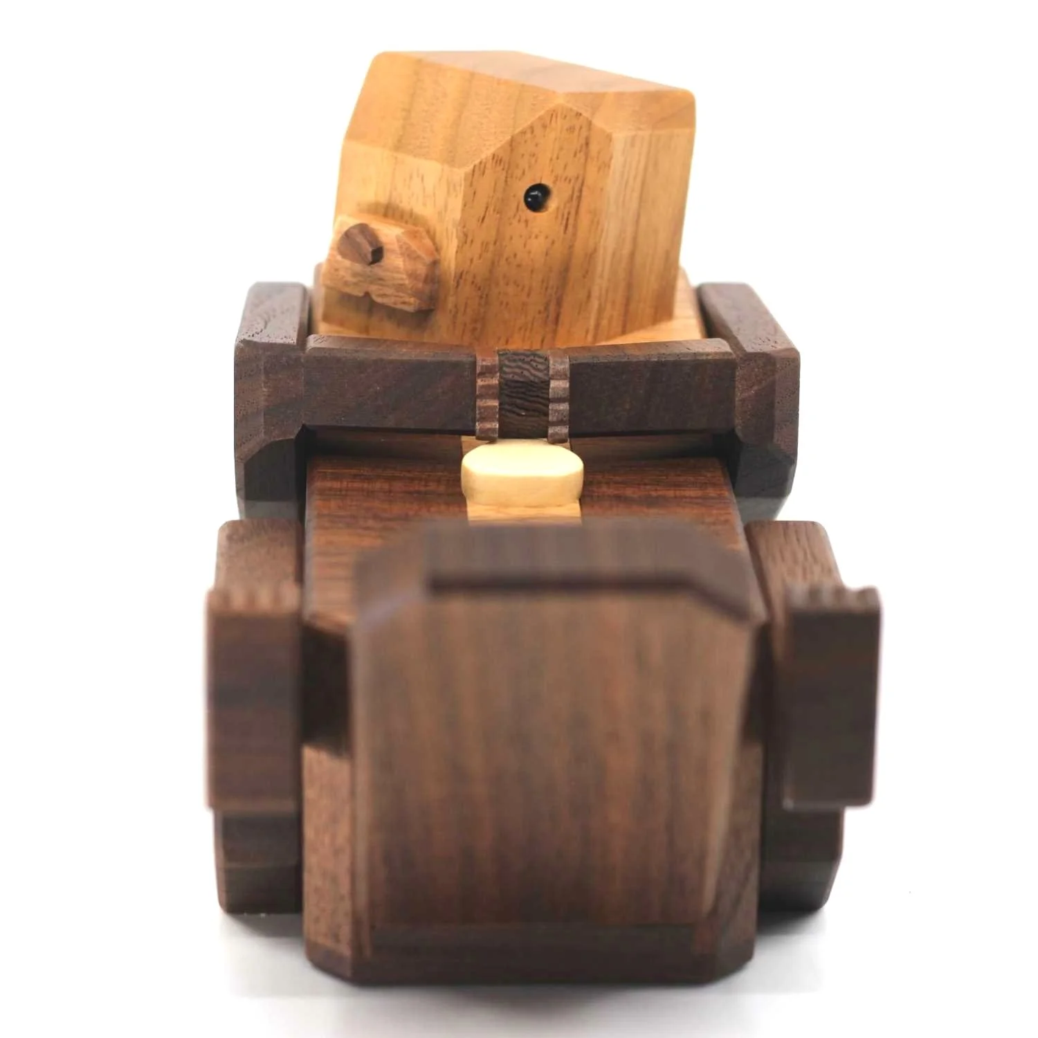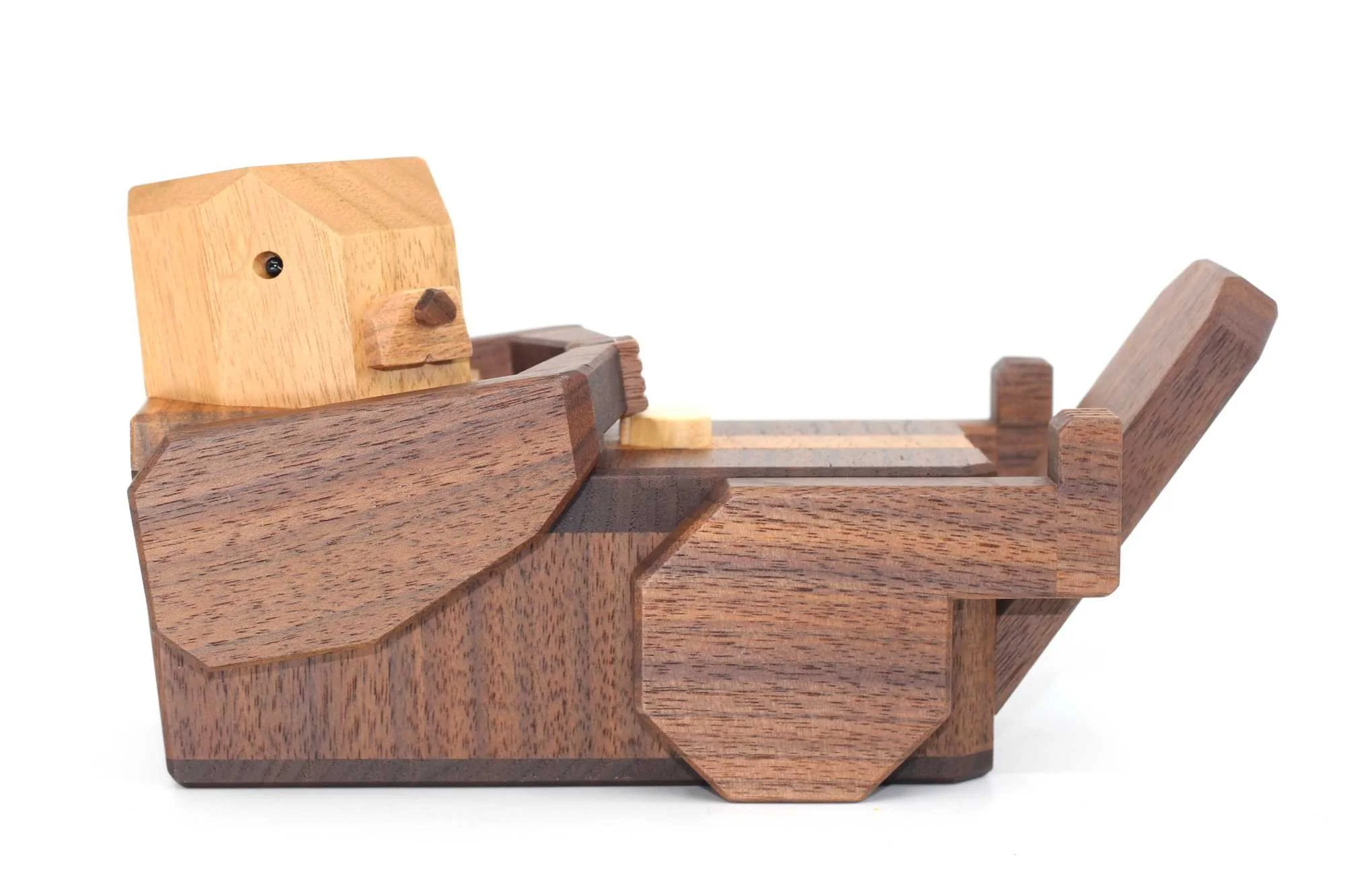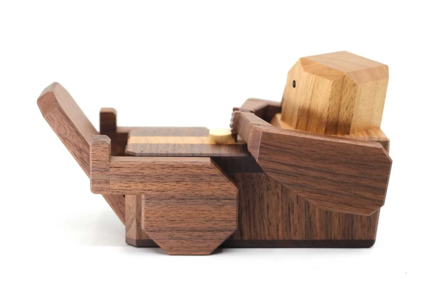 For this reason, I adjusted the angle of the head many times and put glass beads in the eyes in order to express the cuteness of the sea otter. I tried out many different edge treatments to create the look of the nose and the rounded edges of various animals.” I think he has succeeded very nicely, producing a very cute critter and a secret mechanism which combines elements from the theme with those of a traditional Japanese himitsu-bako. Opening the box is not easy or obvious, but once you understand the concept it makes perfect sense, and is rather brilliant.