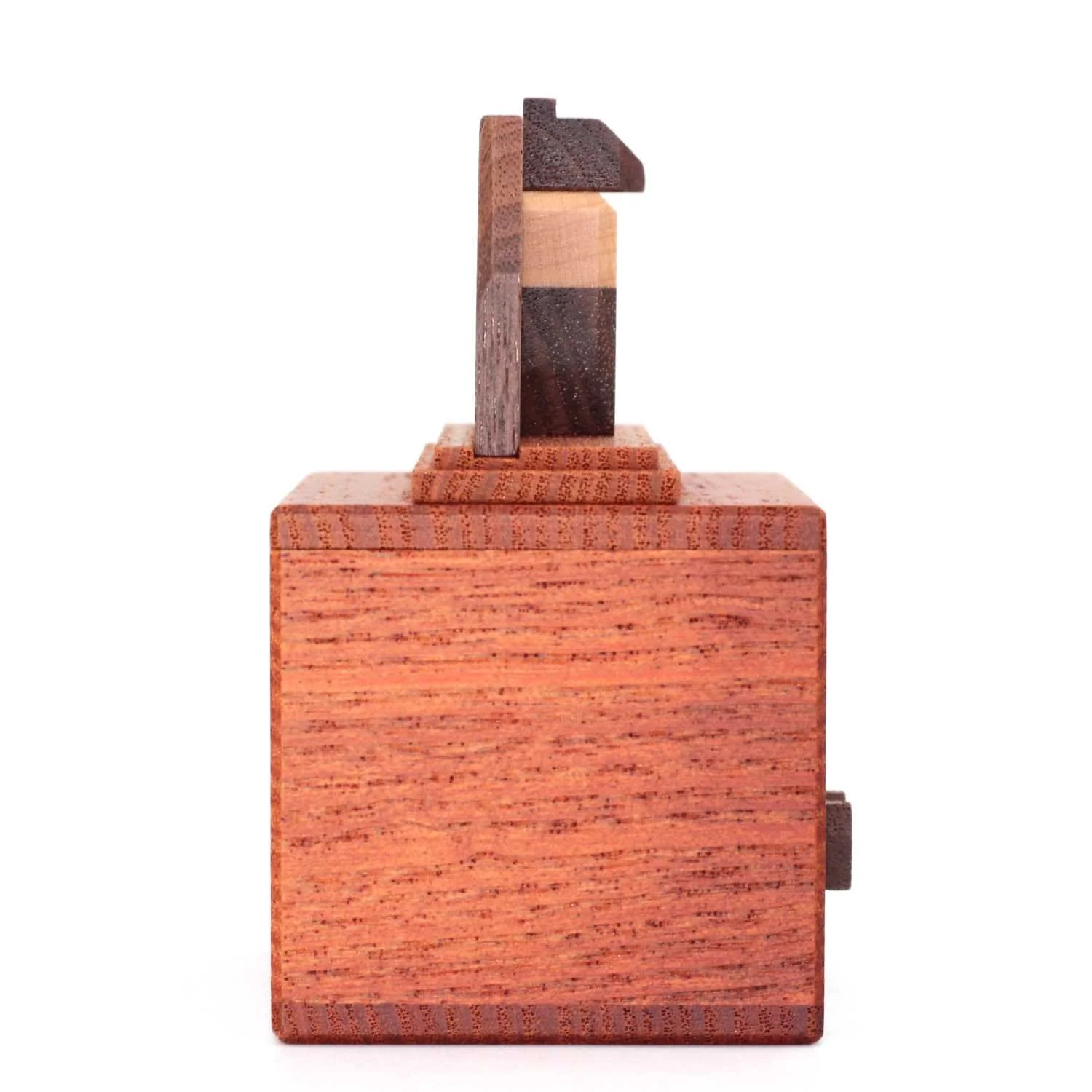 Kakuda’s bat is not like those other scary bats, though. It’s rather adorable, and will make you ponder … a little! In fact it is quite like a classic Kamei puzzle, in the way it mimics the object it reflects. Yoh recently told me a bit of the story. “I was thinking of a Christmas present idea. A simple but interesting box. I was going to make an animal on top of the box and have it rotate at first. But I wanted to make it simpler. So I made it just slide around.”